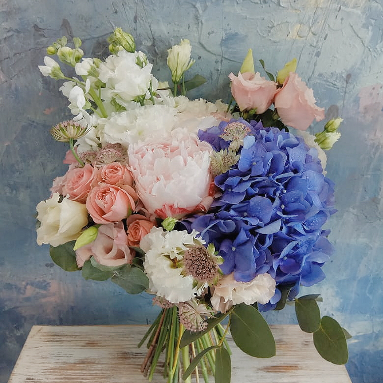 Нежный, милый свадебный букет, свободной сборки и простой округлой формы. в зимнее время гортензия более светлого оттенка и пион будет заменен на пионовидную розу.