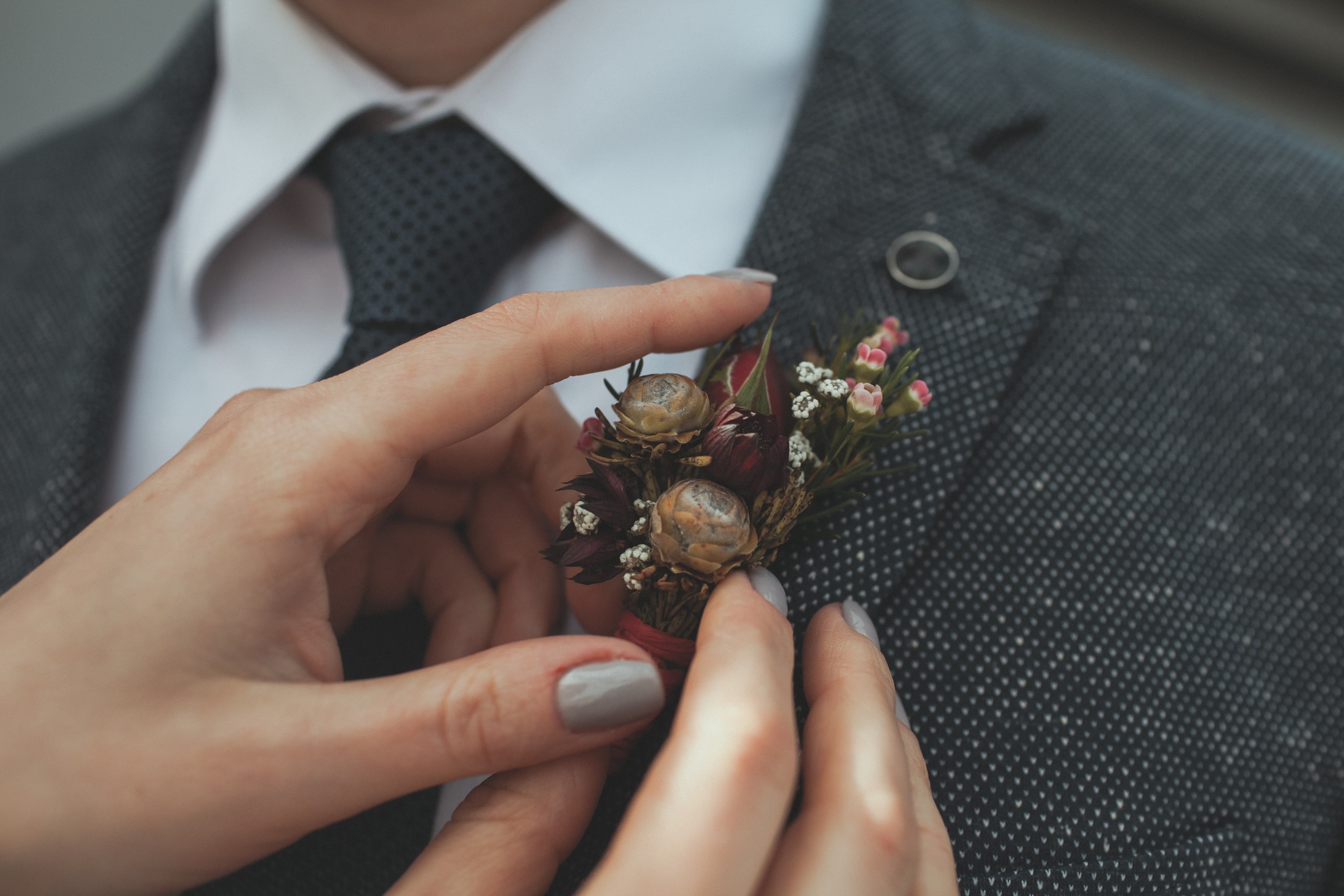 Очень благородное сочетание саловых роз ред пиано и невероятного оттенка капучино, бутоньерка по традиции в подарок